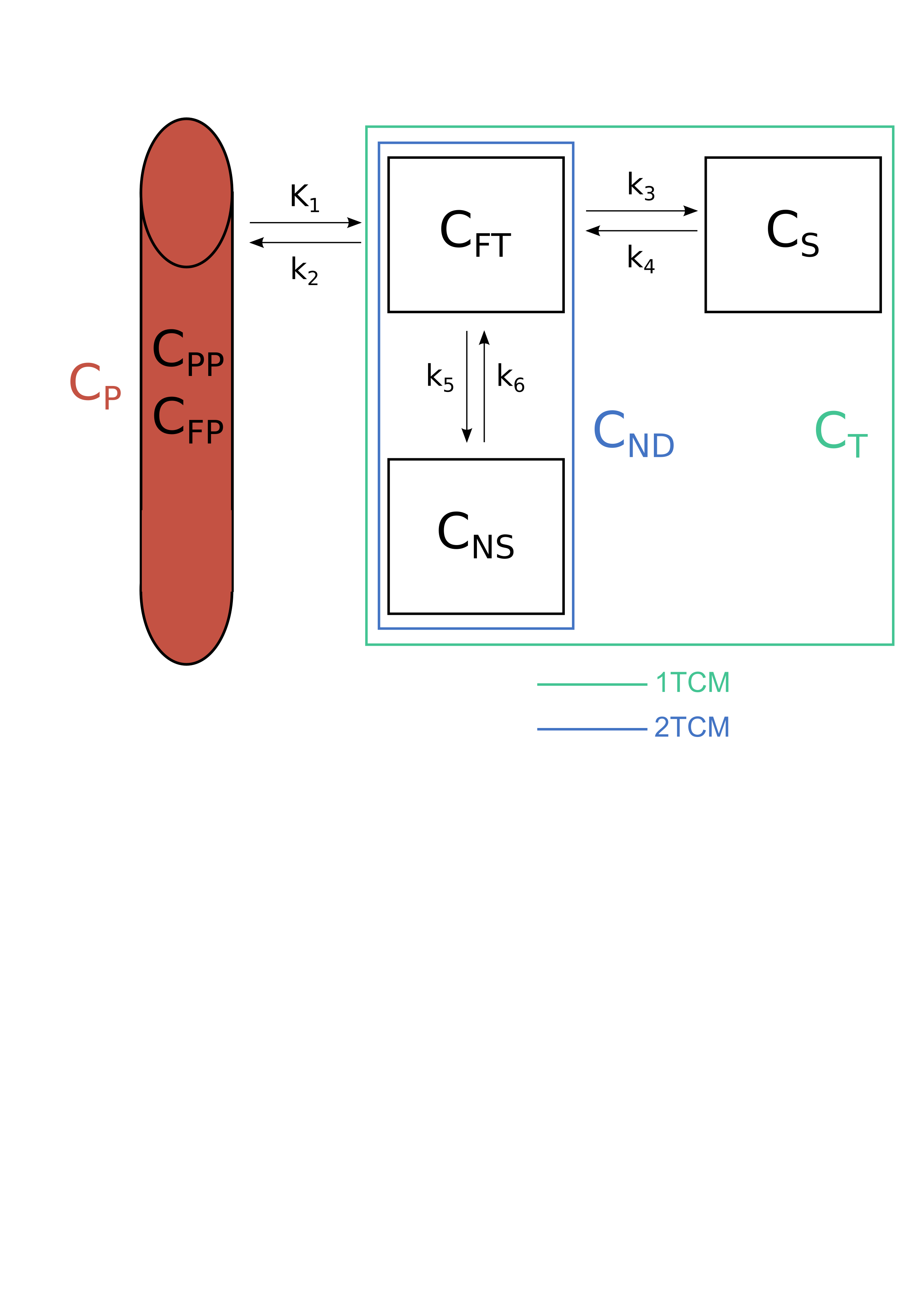 Most models, in biological terms, originate from the three-tissue compartment model, with compartments representing specifically-bound radiotracer (i.e. the stuff we’re interested in), non-specifically-bound radiotracer (i.e. the stuff we’re not interested in), and the free radiotracer (i.e. that is capable of going into one of the other two compartments, or into the blood). This model is very complex, and has a lot of parameters, and I’ve never seen it used in practice. We usually collapse compartments together under the assumption that transfer between them is so rapid as to render the two compartments in constant equilibrium. So, to get the classic two-compartment model, we collapse the free and non-specifically bound compound into a compartment called the non-displaceable compartment (i.e. stuff that another compound that binds to the target molecule wouldn’t displace). And these two are collapsed into one another for the one-compartment model, if dynamics are very fast between all three compartments. Fewer compartments means fewer parameters to fit, which usually means more robust estimates which fit faster. However, if we underfit the data too badly, we can get severely biased estimates.