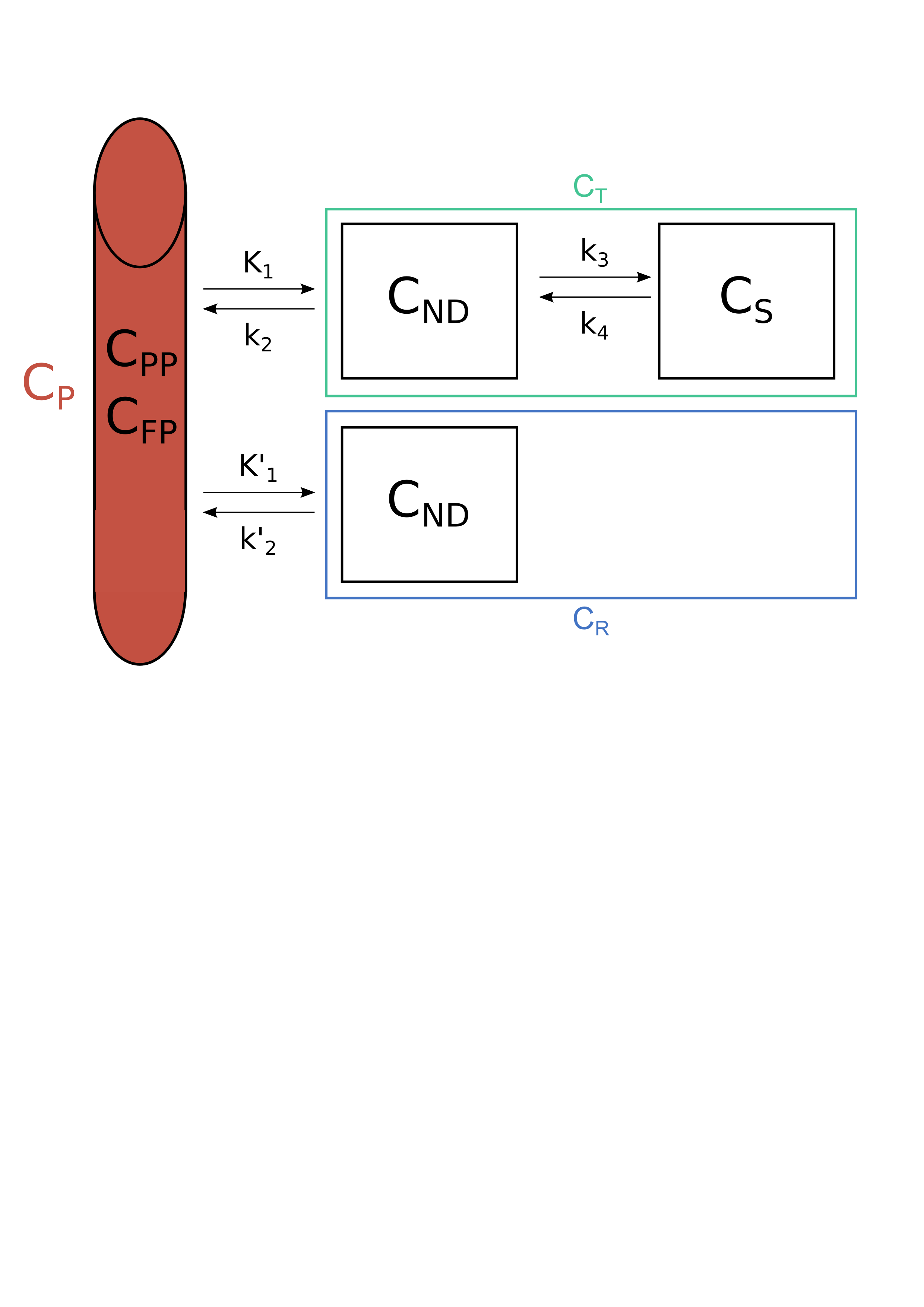 A two-compartmental model then consists of another compartment after the first, which receives radiotracer from the first compartment. Thus, we add the rate constants k3, the travel of radiotracer from the first to the second compartment, and k4, its reverse. As above, if k4 were to be equal to 0, the binding to the second compartment would be irreversible.