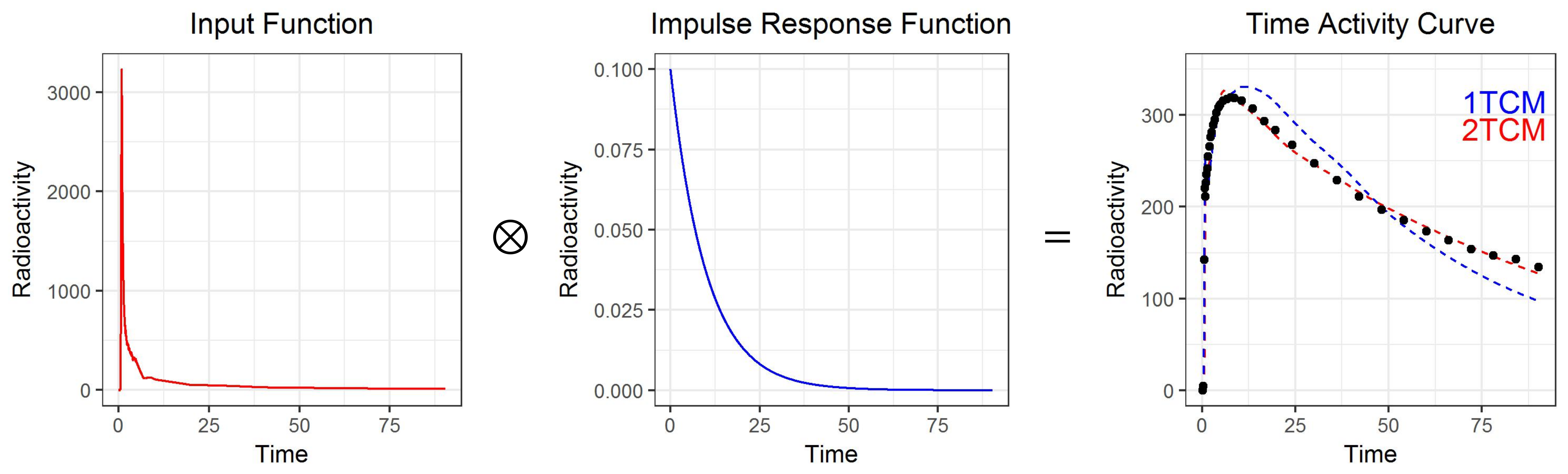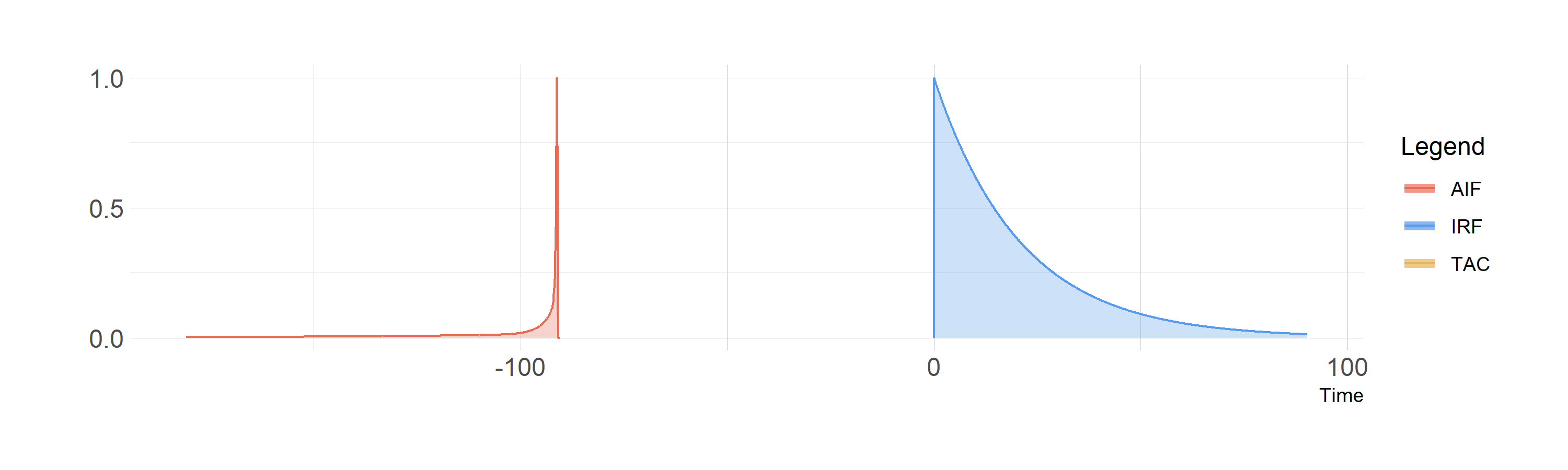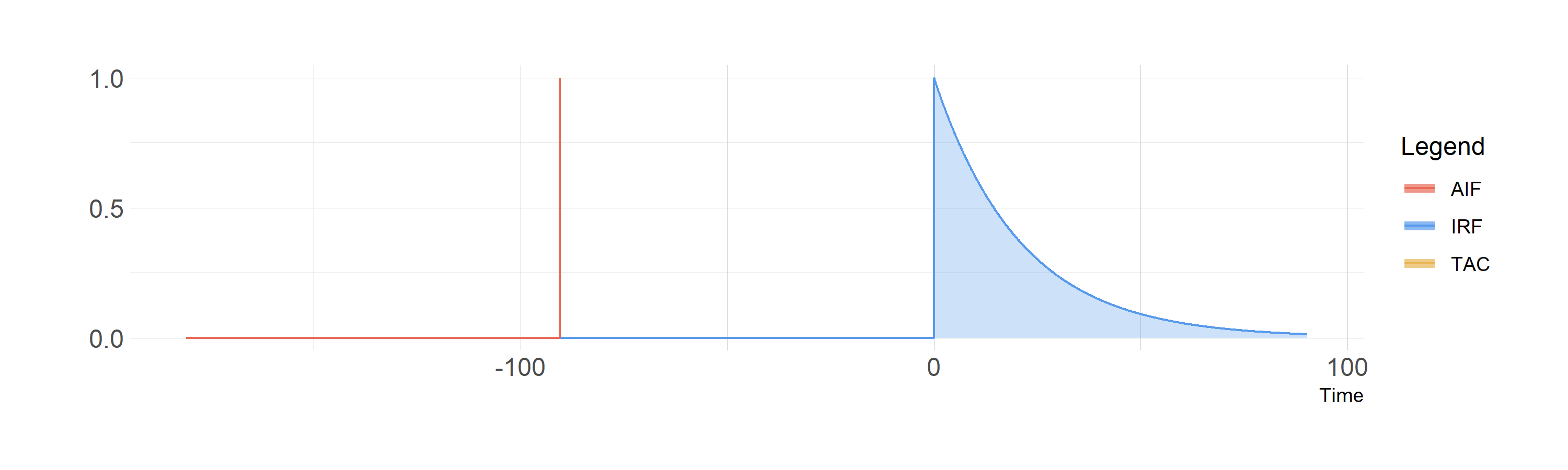 Mathematically, this is instantiated by a convolution (\otimes) between the blood curve (AIF) and an impulse response function (IRF). The impulse response function is the expected curve if we could perform the perfect instantaneous injection of the radiotracer to the region itself: it would be the equivalent of pouring one single bucket of water into the bath, and is described by an exponential decay, or a sum of exponential decays.