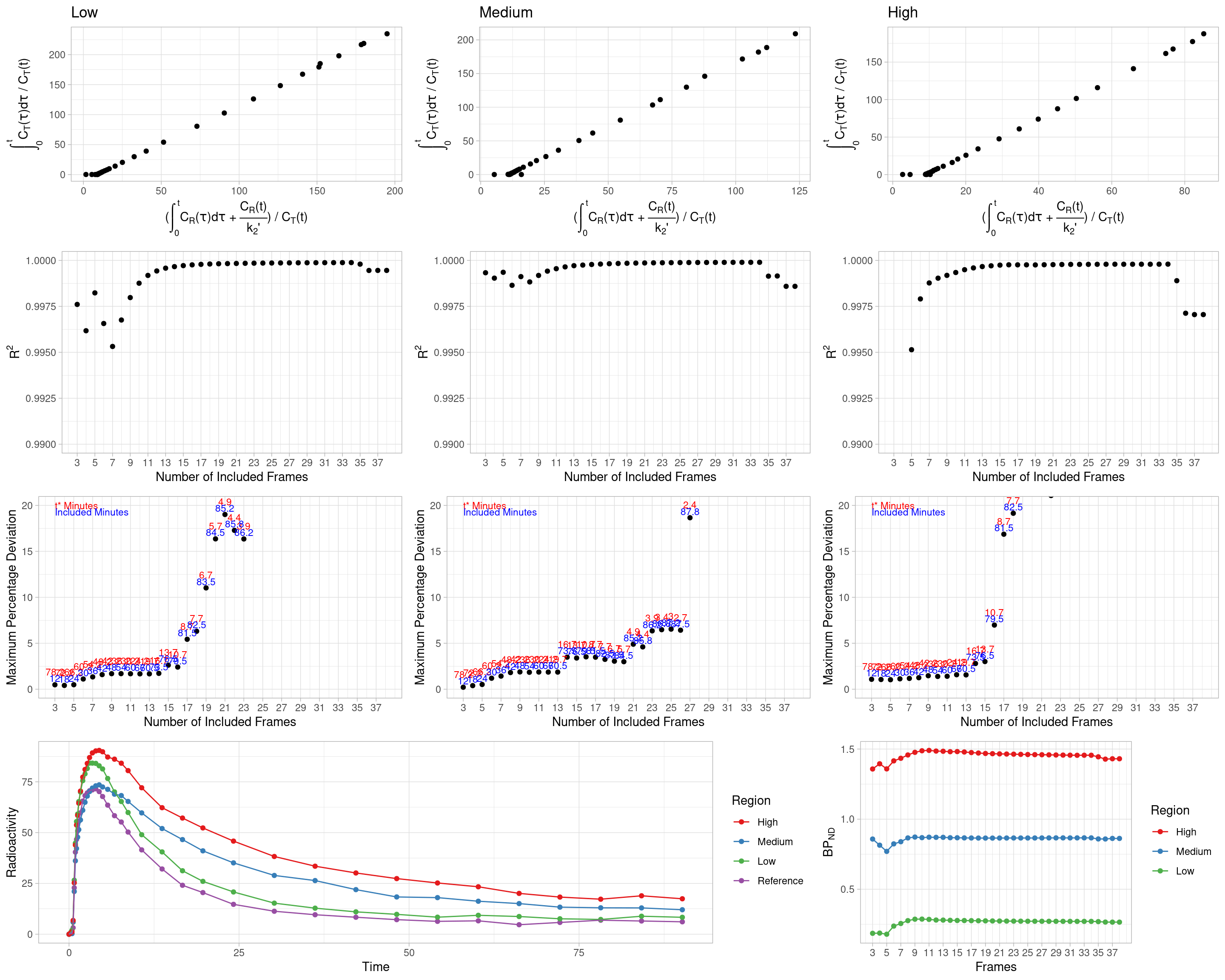 In my opinion, the best approach is to look at several individuals, and several ROIs, and choose a number of frames which is generally applicable, and which keeps a fairly low degree of error. I don’t like the idea of having a strict binary criterion, and I don’t like assessing it on an individual basis. It is worth considering, though, that if you are only interested in specific regions with high or low binding, then it might be worthwhile selecting a t* value that works for those regions specifically, and not examining the rest. This can cause you to estimate the other regions poorly, but estimate for the region you’re specifically interested in better.
