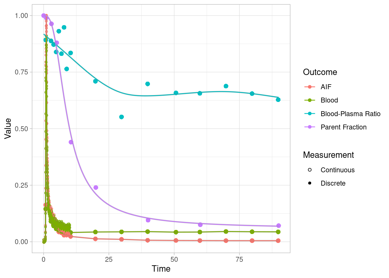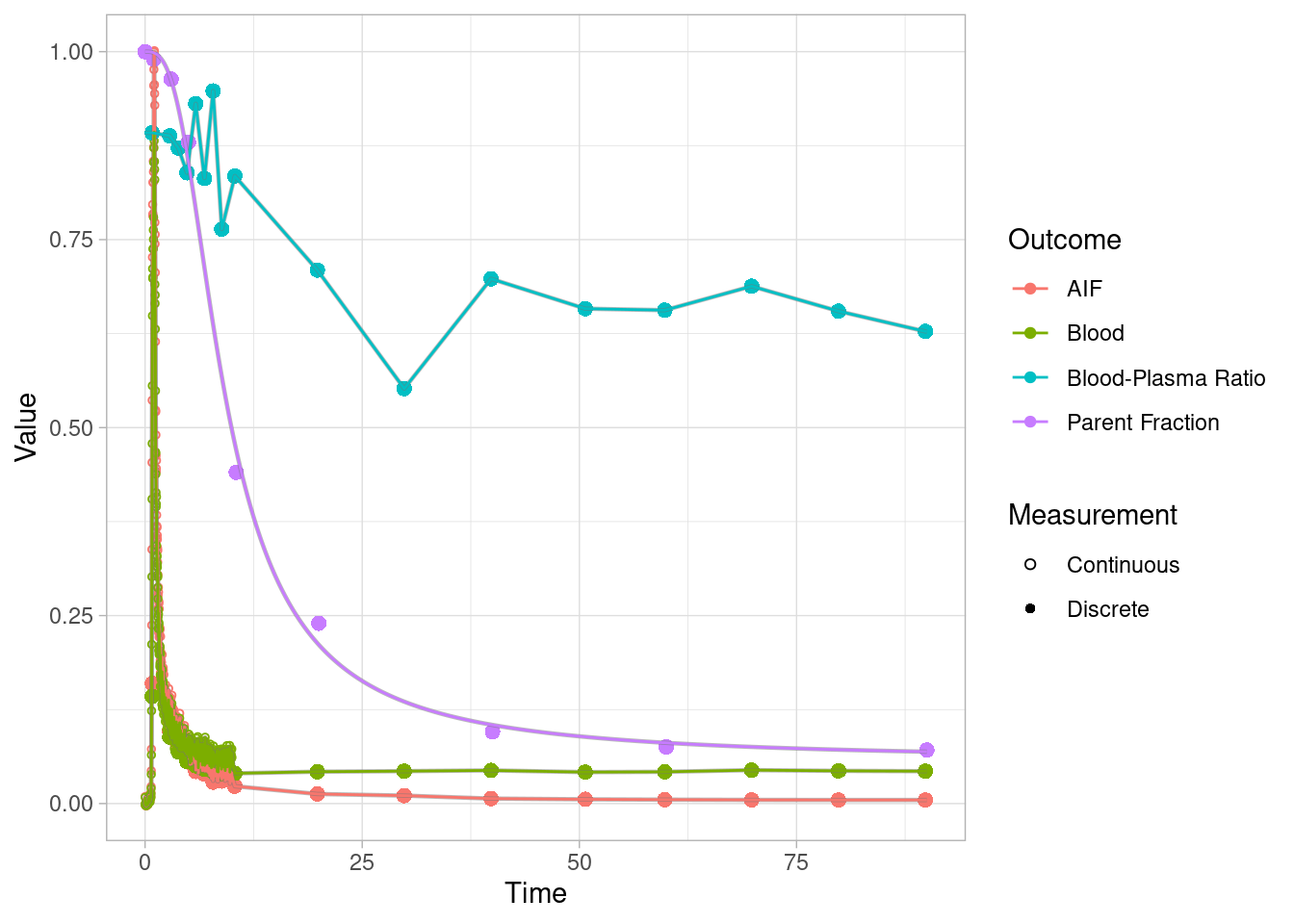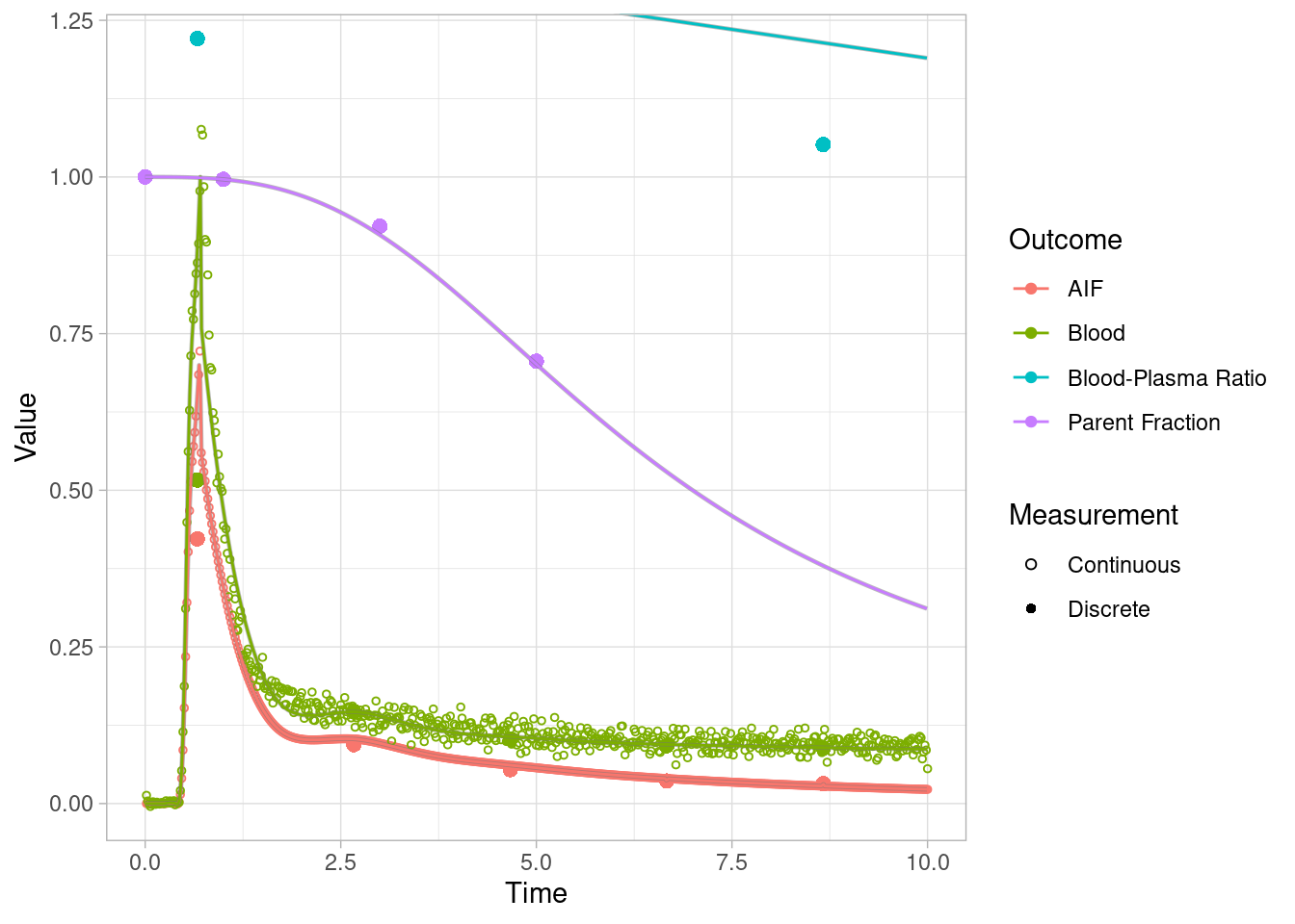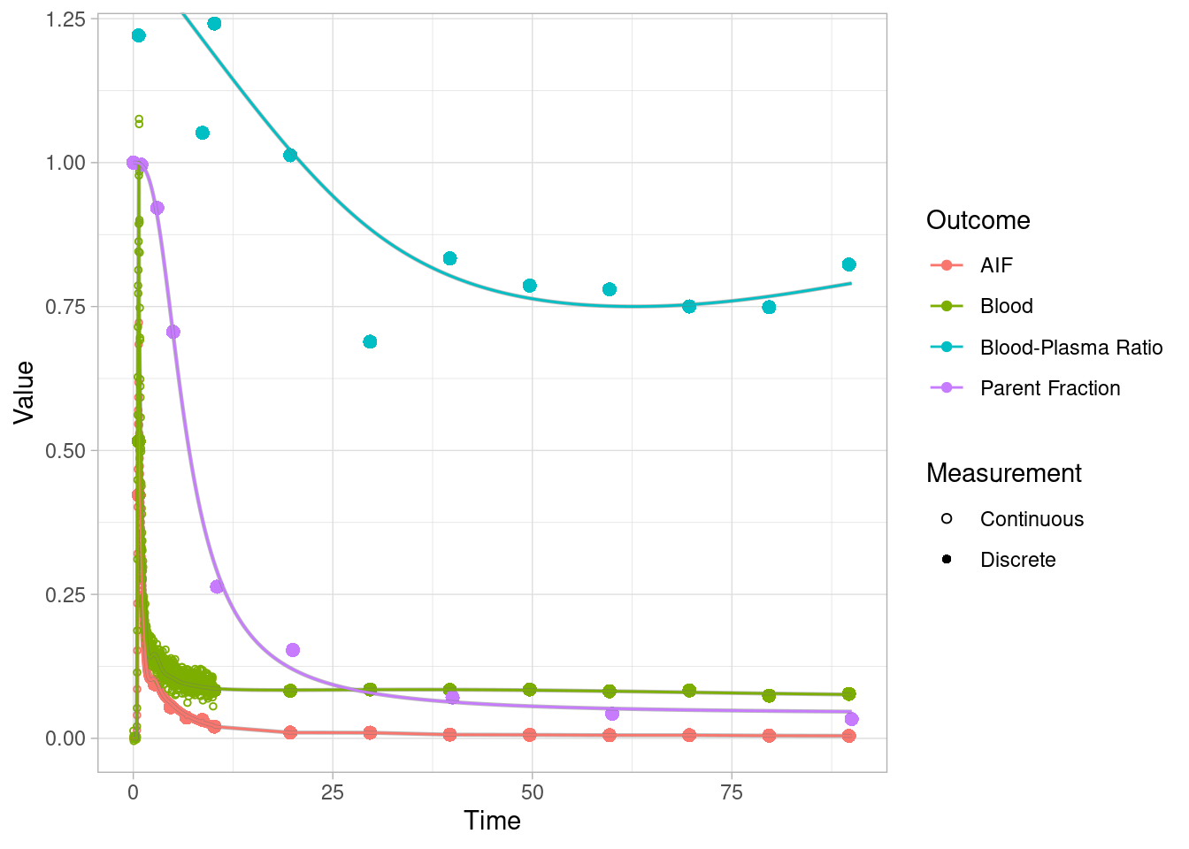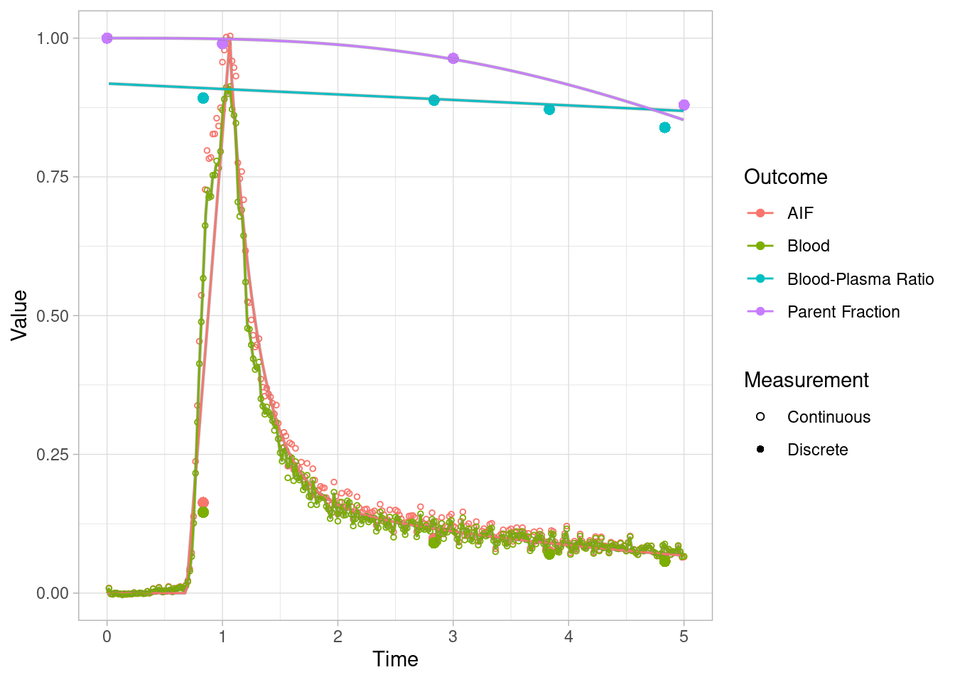 Now, when it comes to the AIF, it is again important to remember just what our “data” is. We have blood data, which gets multiplied by the blood-to-plasma ratio to get the plasma data. Then we have to multiply this through the parent fraction to get the metabolite-corrected AIF. So, modelling the previous curves has served as preprocessing for getting our AIF data to look as good as we can get it. And now we’re going to model the result of those steps.