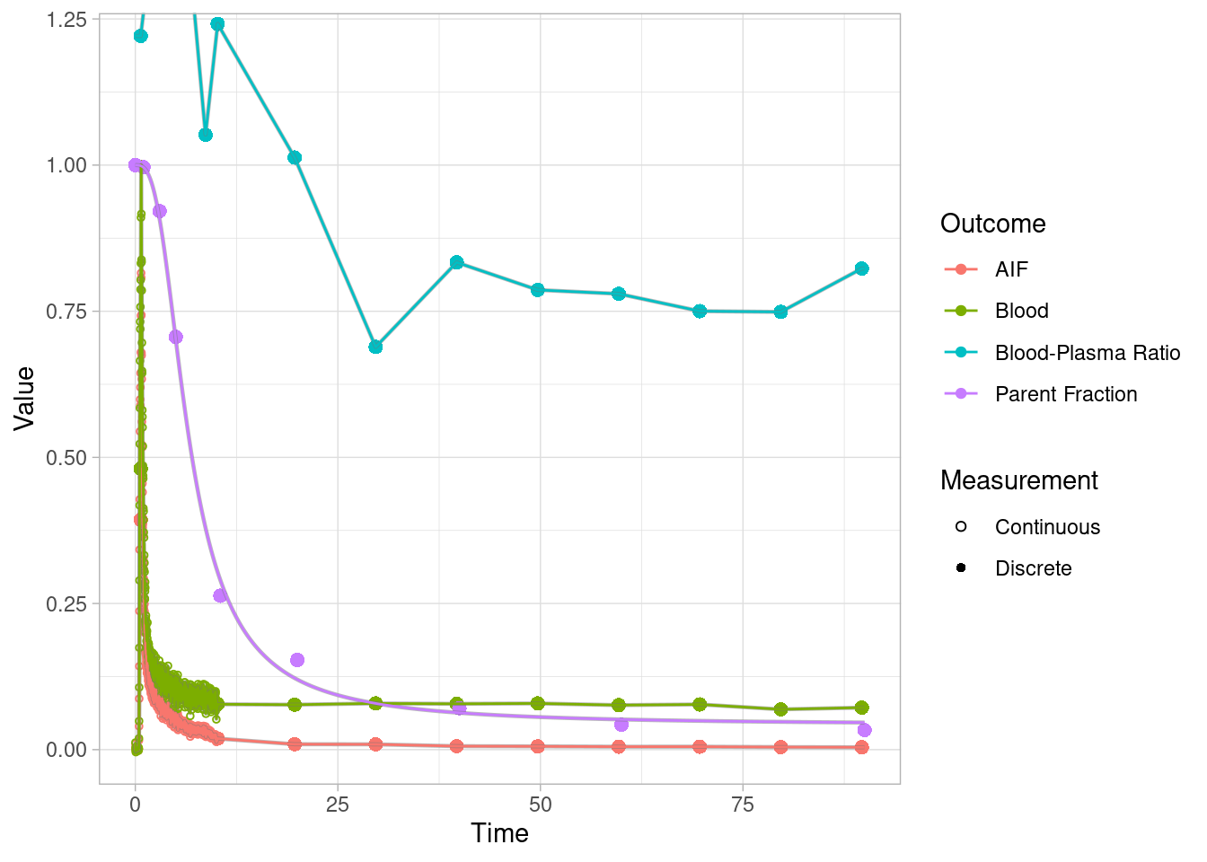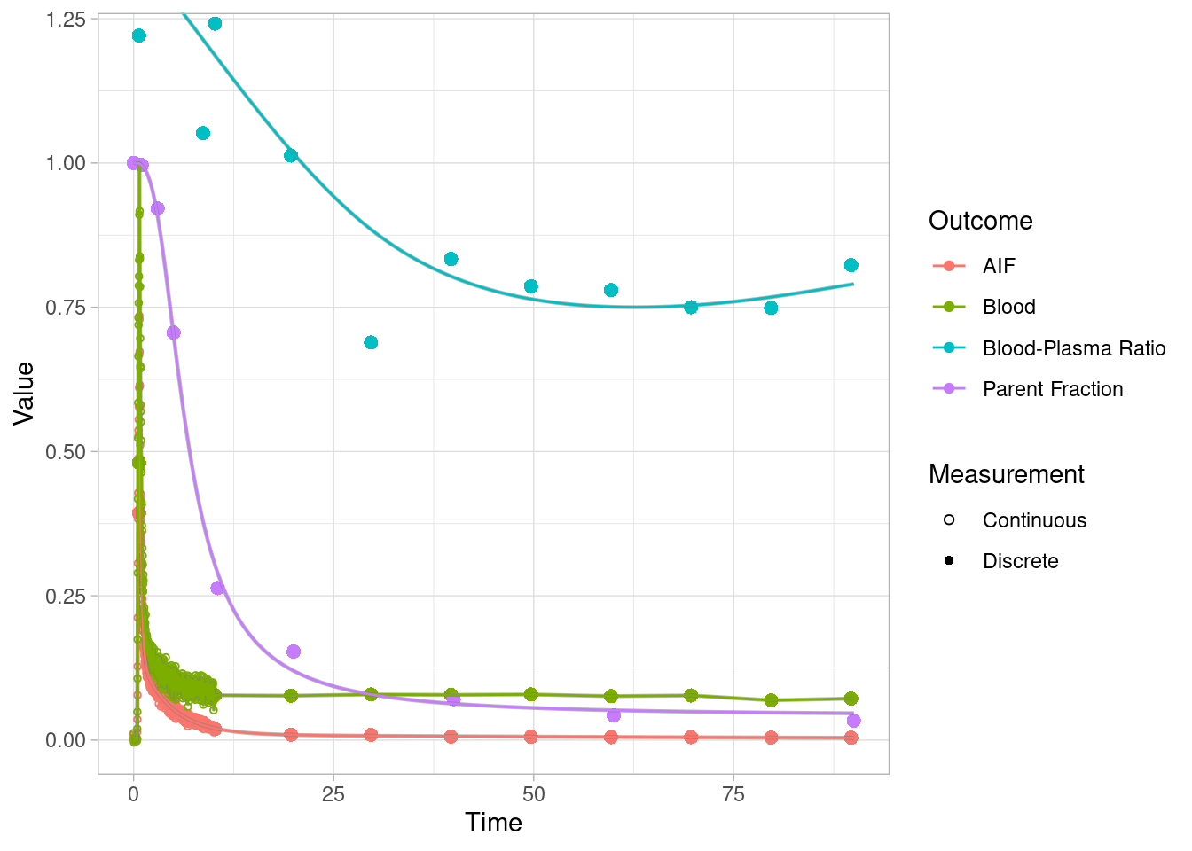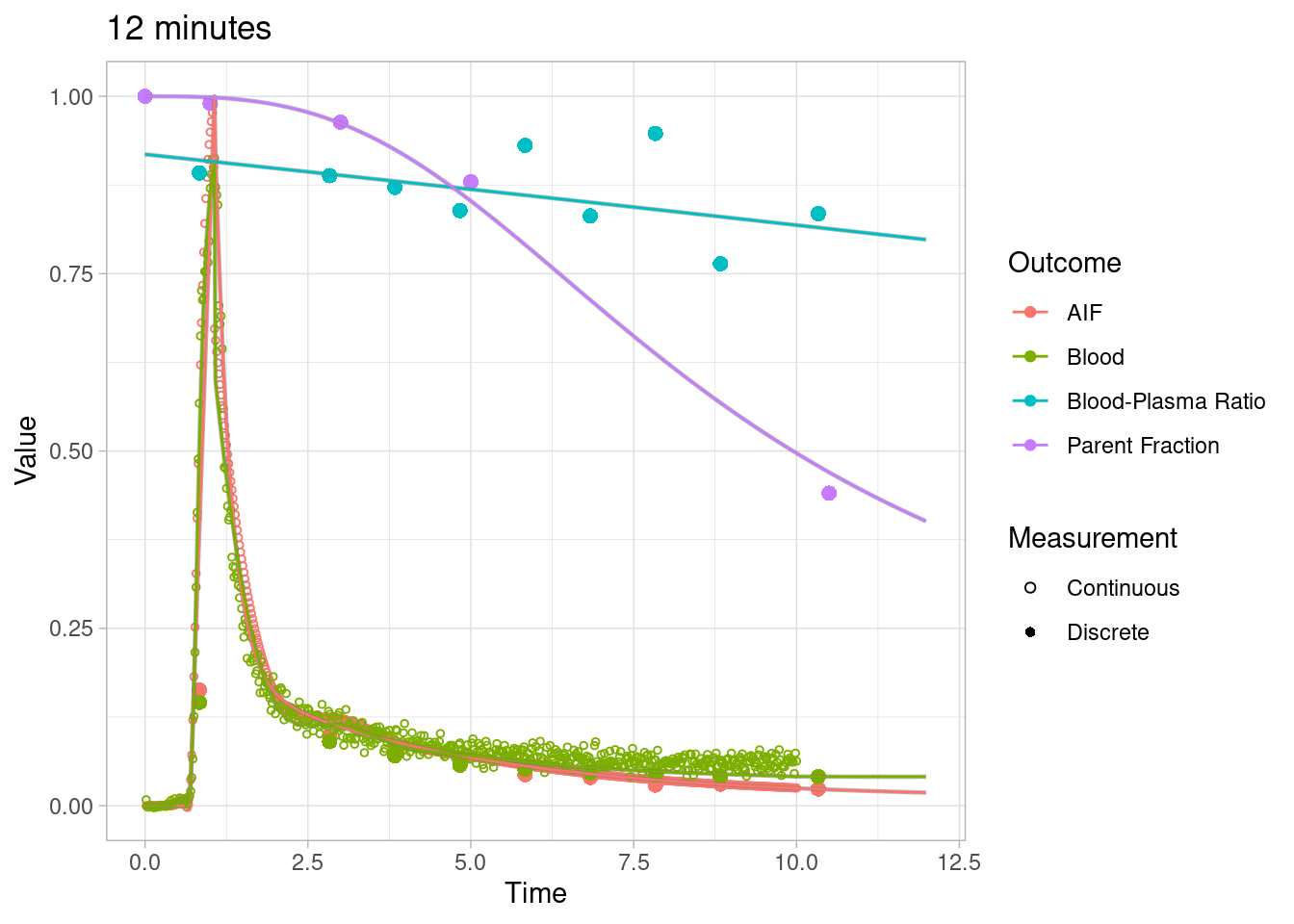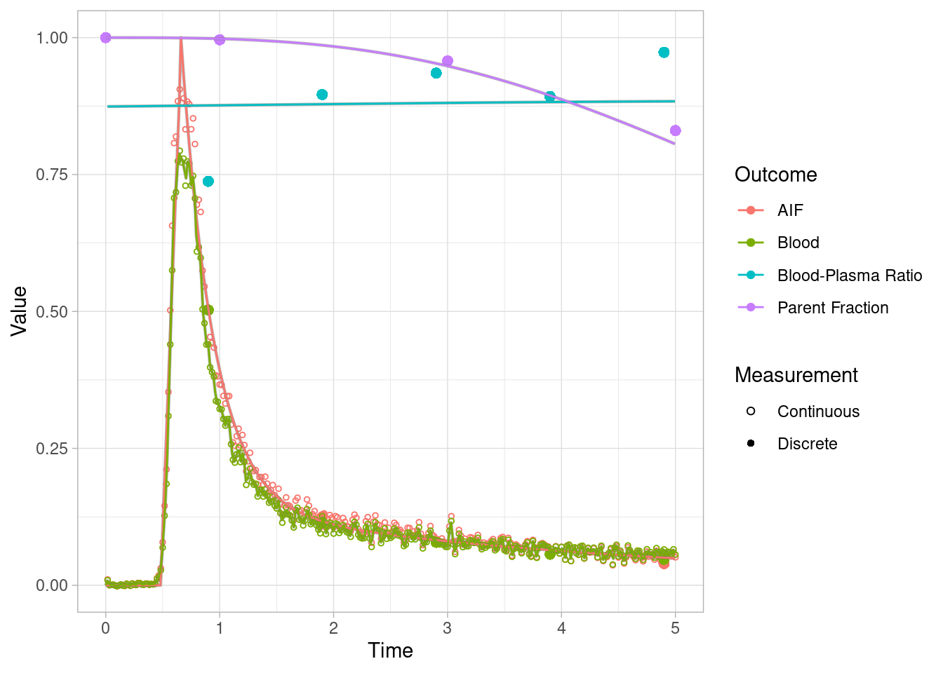 Now, when it comes to the AIF, it is again important to remember just what our “data” is. We have blood data, which gets multiplied by the blood-to-plasma ratio to get the plasma data. Then we have to multiply this through the parent fraction to get the metabolite-corrected AIF. So, modelling the previous curves has served as preprocessing for getting our AIF data to look as good as we can get it. And now we’re going to model the result of those steps.