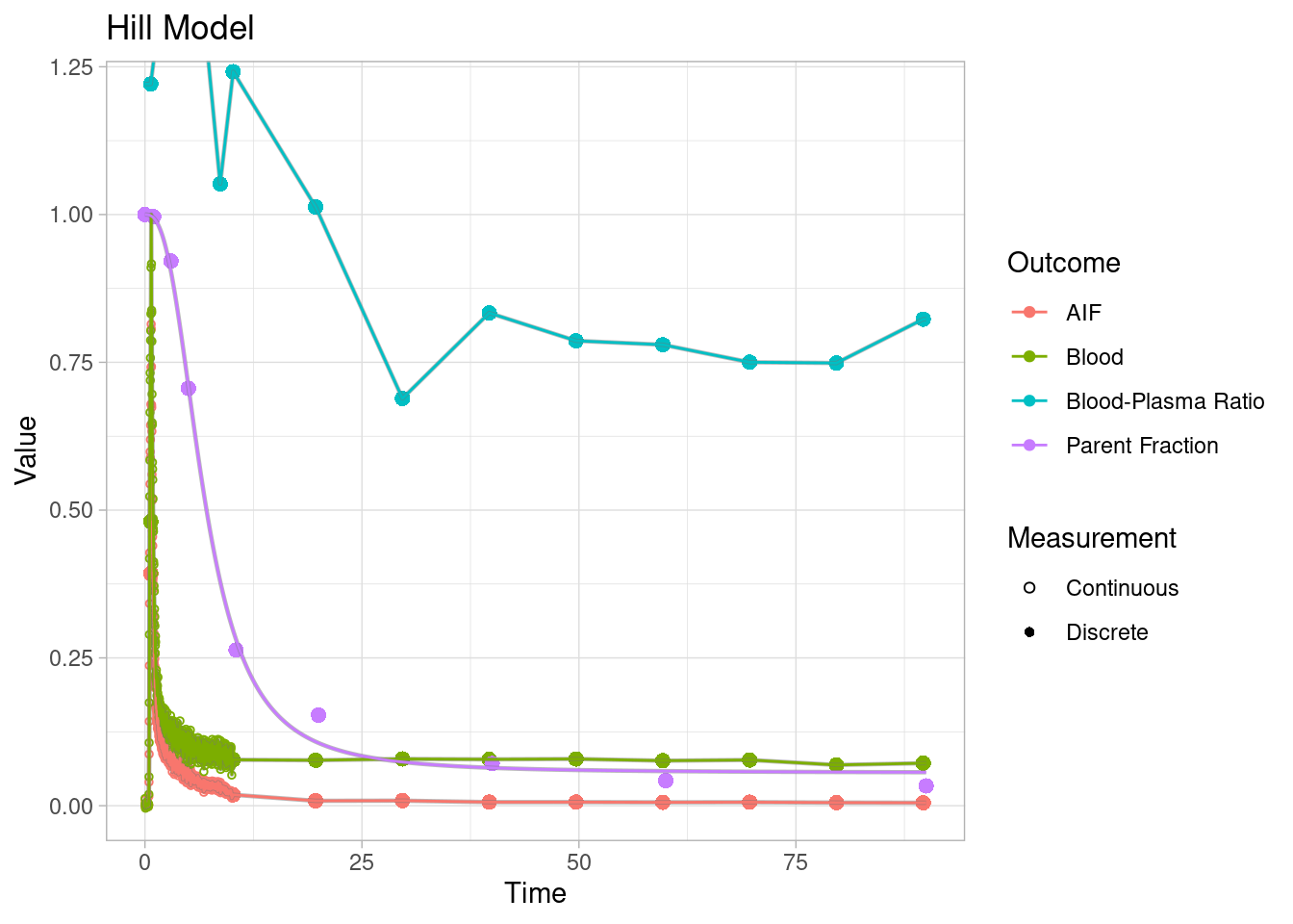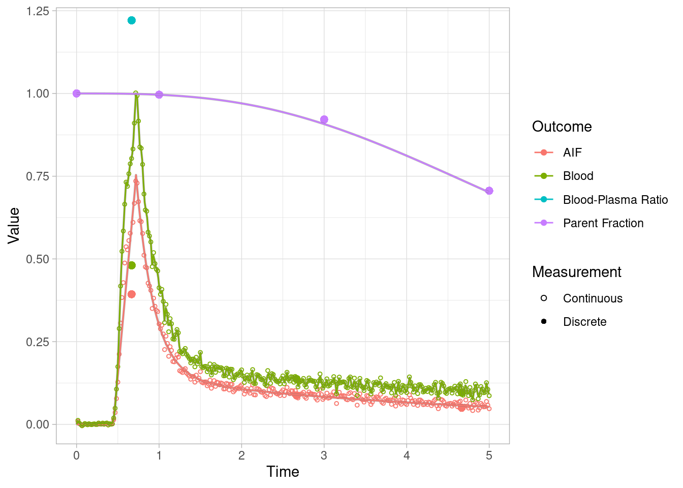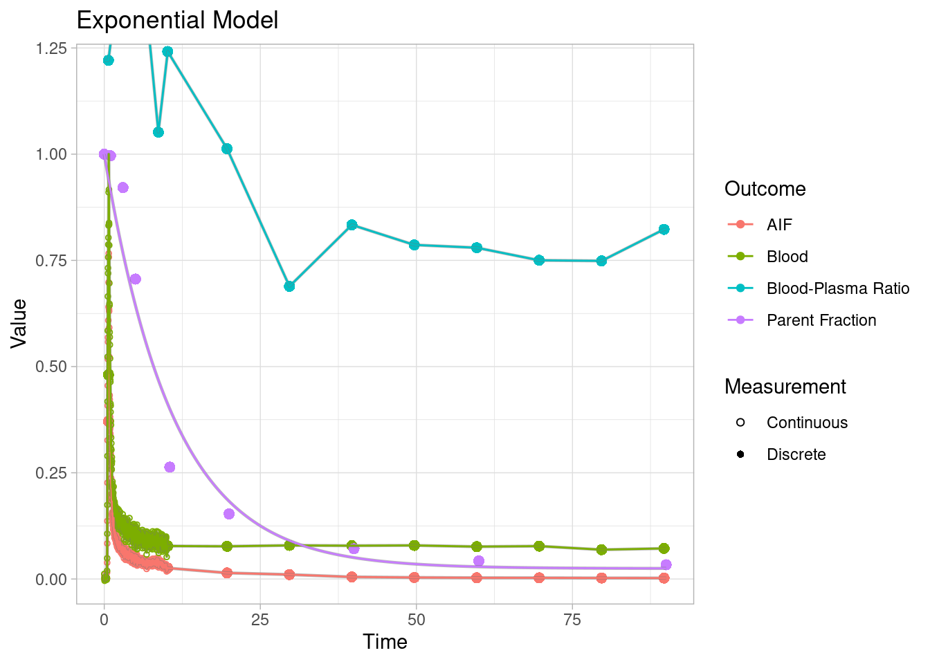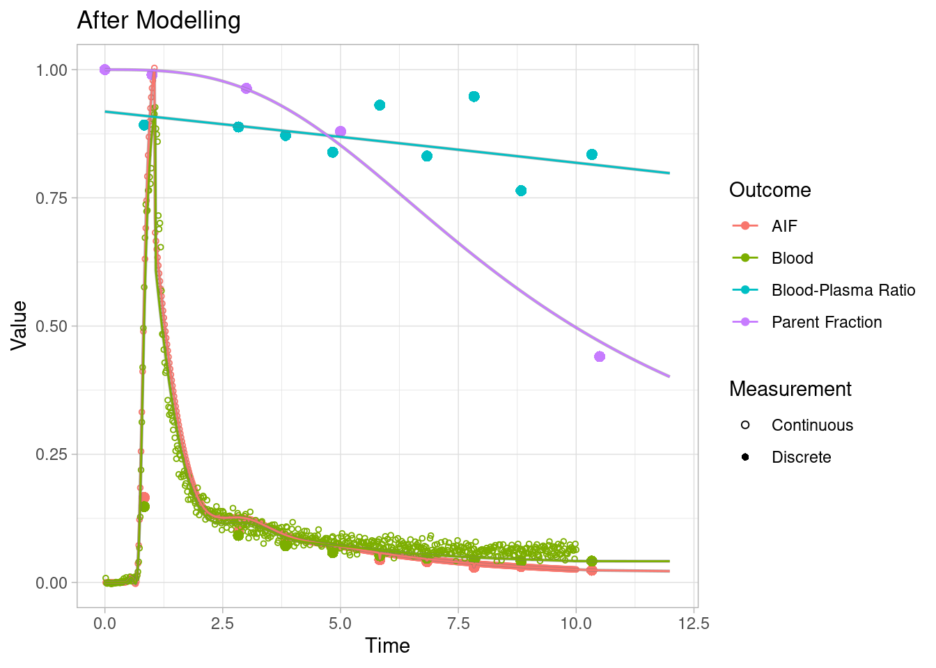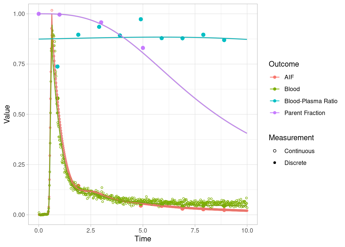 Now, when it comes to the AIF, it is again important to remember just what our “data” is. We have blood data, which gets multiplied by the blood-to-plasma ratio to get the plasma data. Then we have to multiply this through the parent fraction to get the metabolite-corrected AIF. So, modelling the previous curves has served as preprocessing for getting our AIF data to look as good as we can get it. And now we’re going to model the result of those steps.