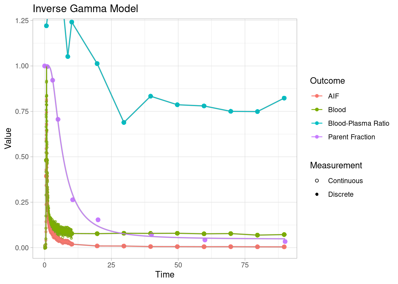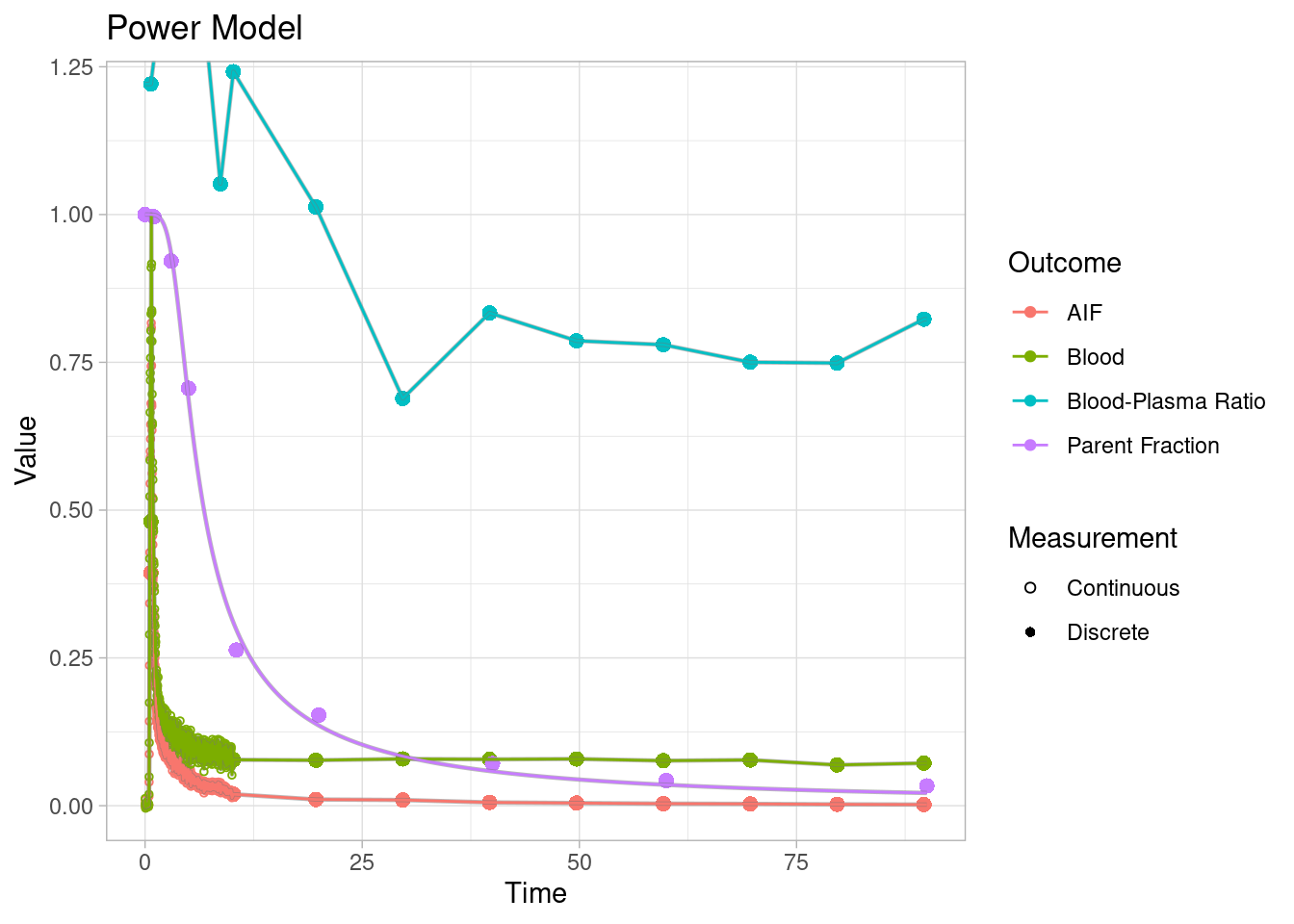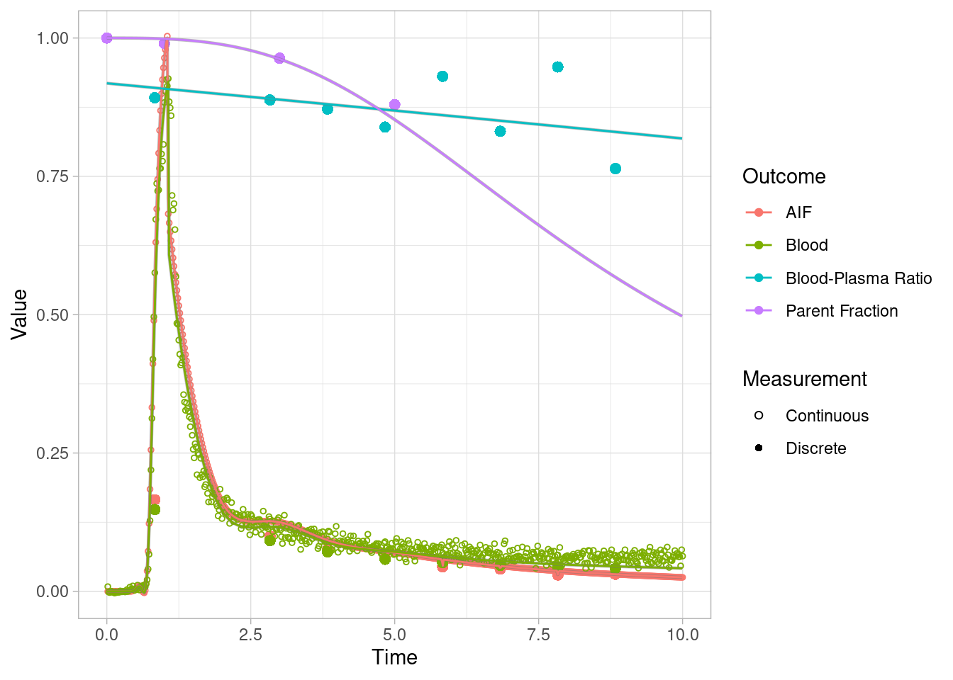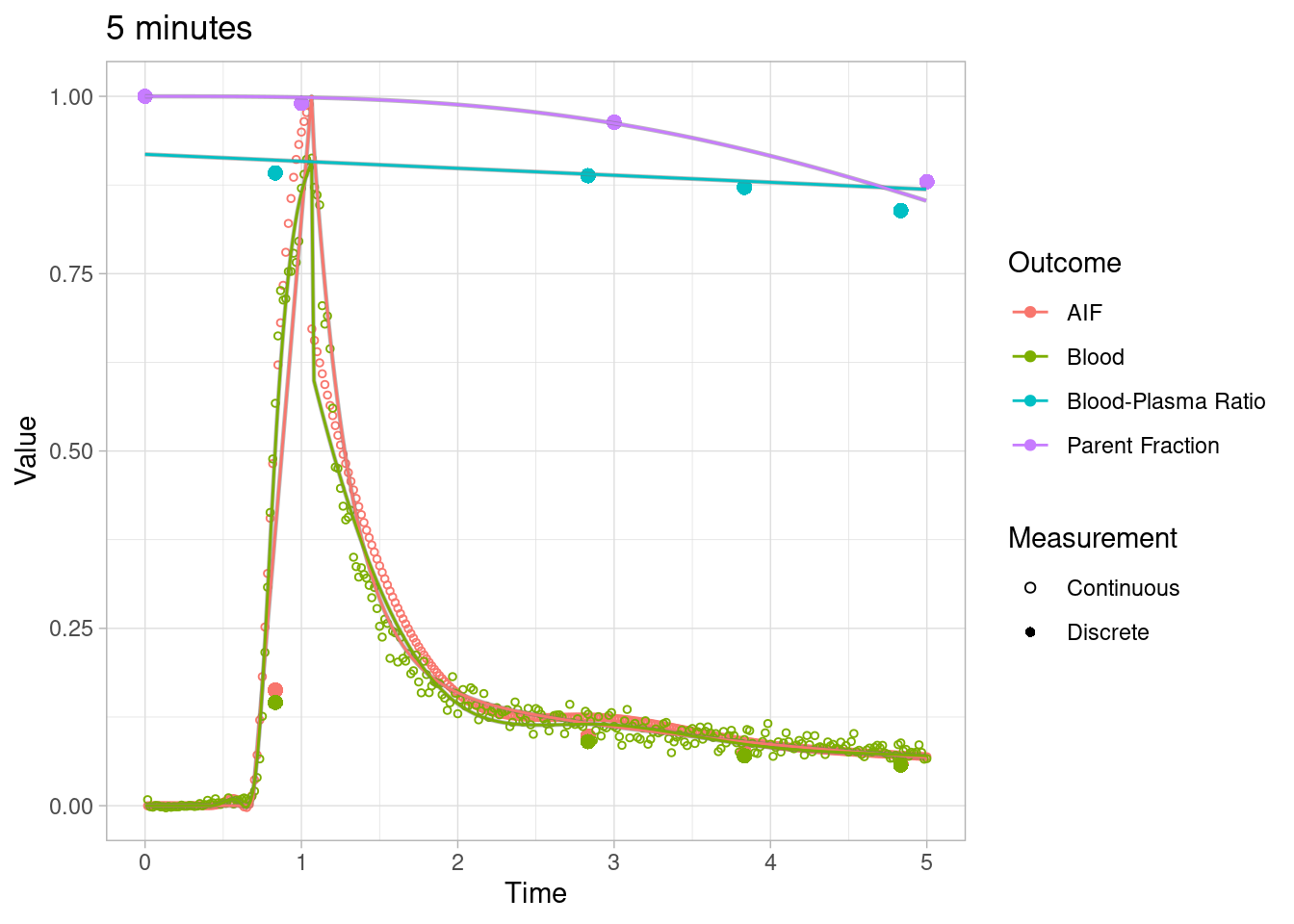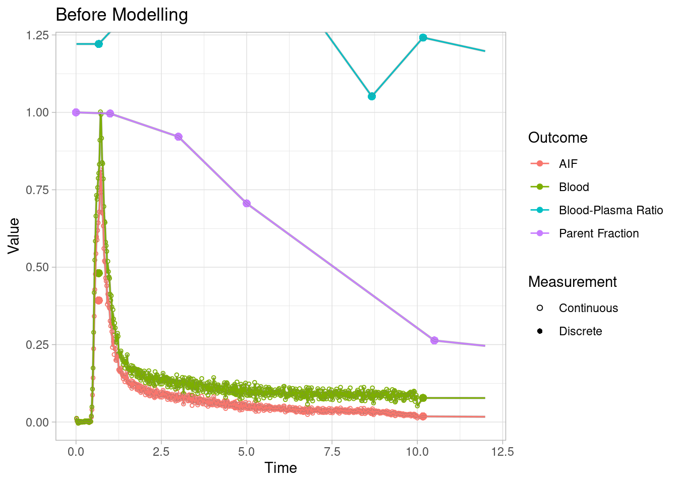 Now, when it comes to the AIF, it is again important to remember just what our “data” is. We have blood data, which gets multiplied by the blood-to-plasma ratio to get the plasma data. Then we have to multiply this through the parent fraction to get the metabolite-corrected AIF. So, modelling the previous curves has served as preprocessing for getting our AIF data to look as good as we can get it. And now we’re going to model the result of those steps.