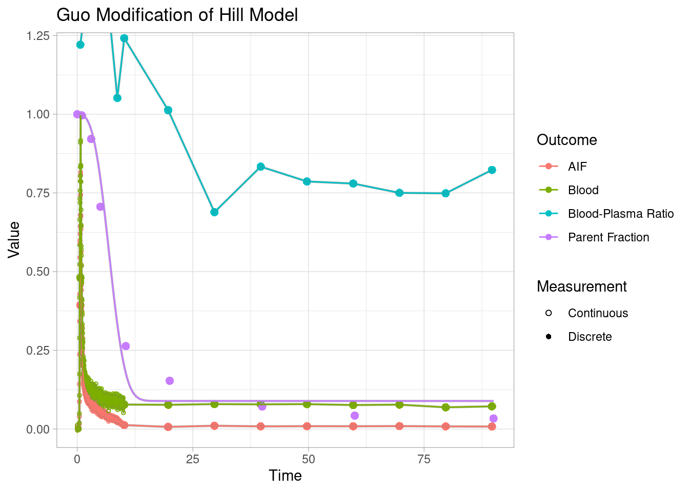 Each of these models have their own specific shapes, which we must select between to model the shape of the metabolism curve for each tracer. And then there are heaps of modification of all the different models which are created to adapt to curves which slightly differ from the primary models. In this case, we can see that the power and inverse gamma models are not able to level out towards the end sufficiently. The exponential model can’t handle the slow start, but does level out. The Hill model handles the end nicely, but can’t quite hit the values in the middle. The Guo modification does a pretty good job of representing the curve though.